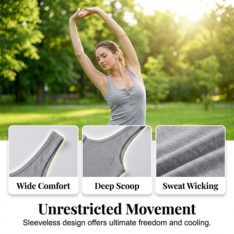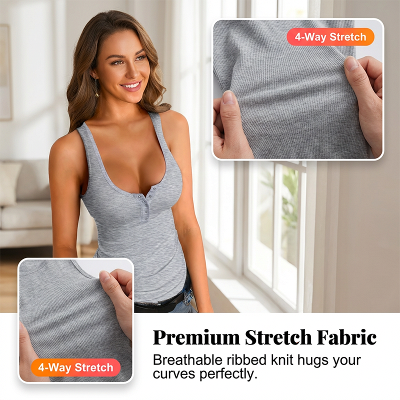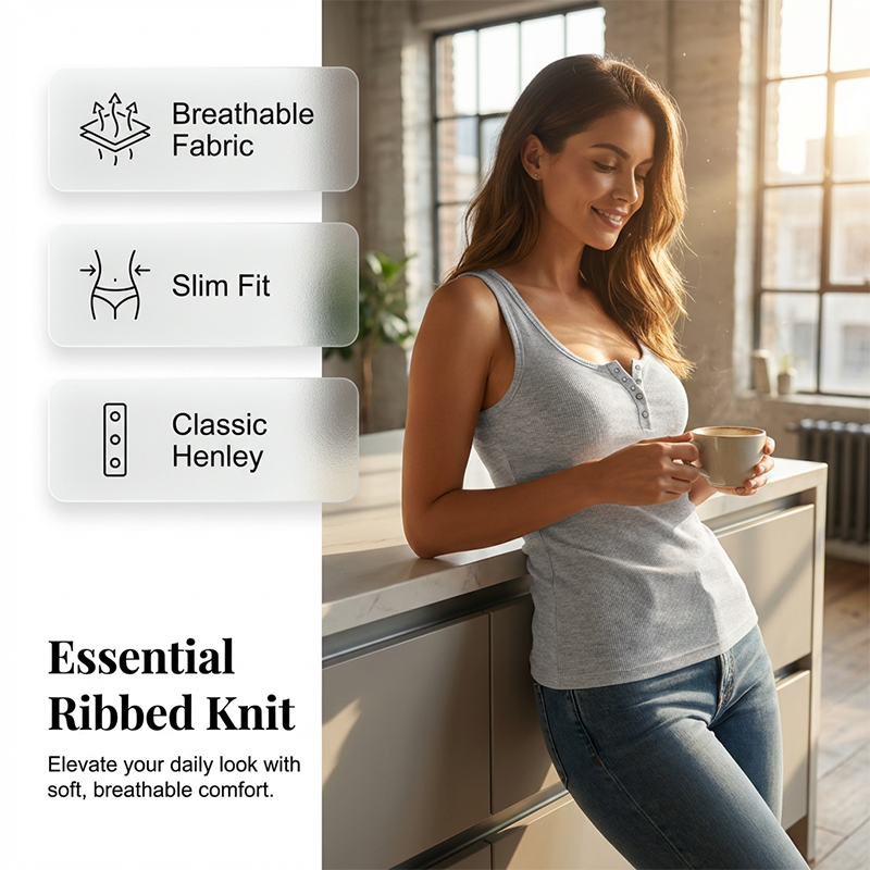 RUNDHALSAUSSCHNITT MIT KNOPFLEISTE – Der klassische Henley-Stil verleiht einem einfachen Tanktop eine optisch interessante Note. Er ermöglicht es Ihnen, den Ausschnitt für verschiedene Looks anzupassen und bietet sowohl Stil als auch vielseitigen Komfort.