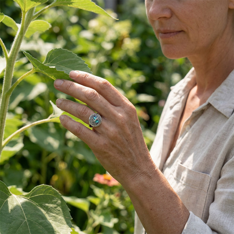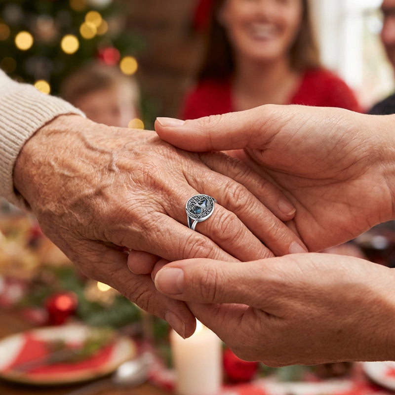 KELTISCHER KNOTENRAND – Die ineinander verwobenen keltischen Knoten, die den Baum umgeben, symbolisieren Ewigkeit und Verbundenheit. Dieses zeitlose Muster fügt eine zusätzliche Ebene der Symbolik und kunstvollen Schönheit hinzu und unterstreicht die elegante und bedeutungsvolle Ausstrahlung des Rings.